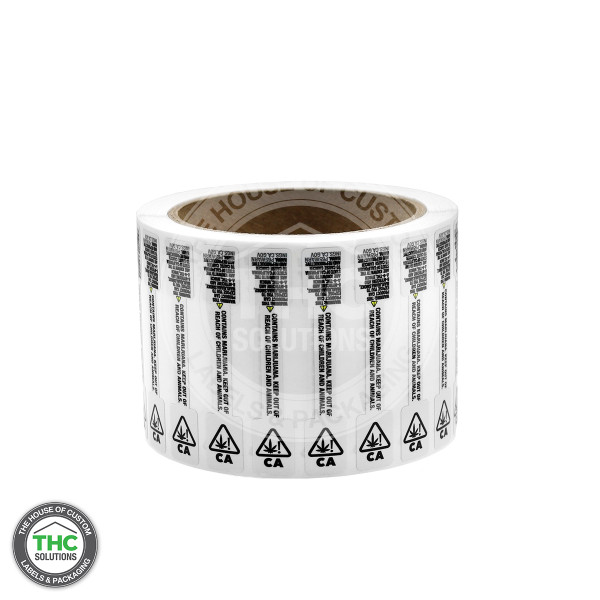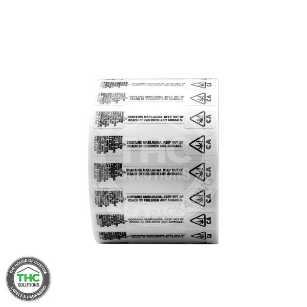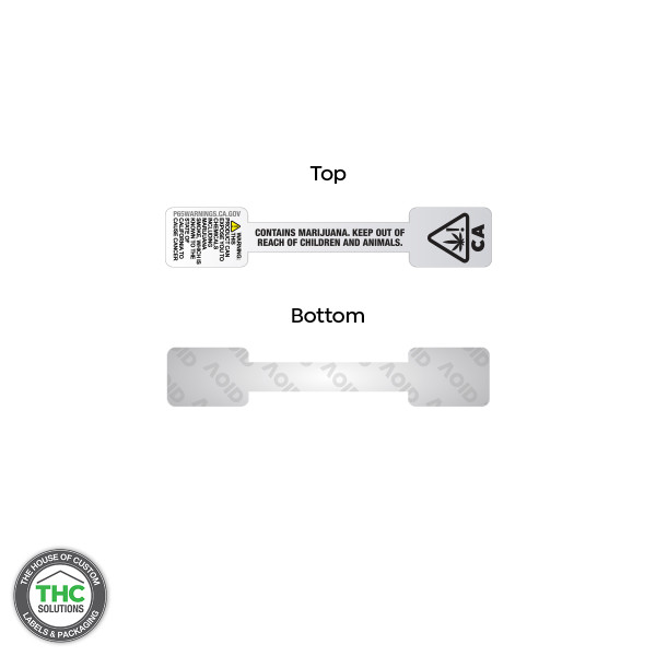 California Prop 65 Warning tamper evident label, with a silver poly void text left behind if removed.