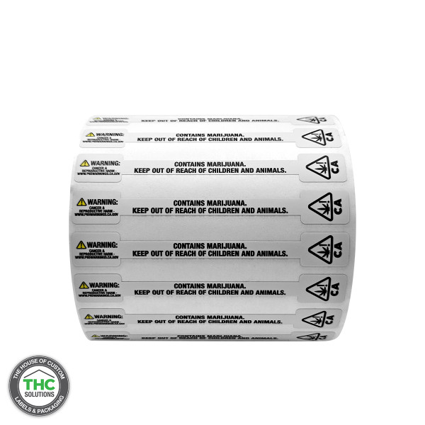 California Prop 65 Warning tamper evident label, with a silver poly void text left behind if removed.