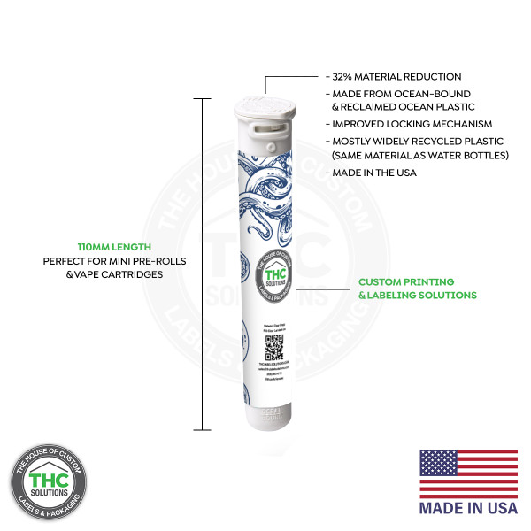 These reclaimed ocean plastic pre roll tubes are fully customizable. Make your brand stand out with your custom label design or custom tamper evident labels for your pre-roll tubes to help create a clean and sleek look.
