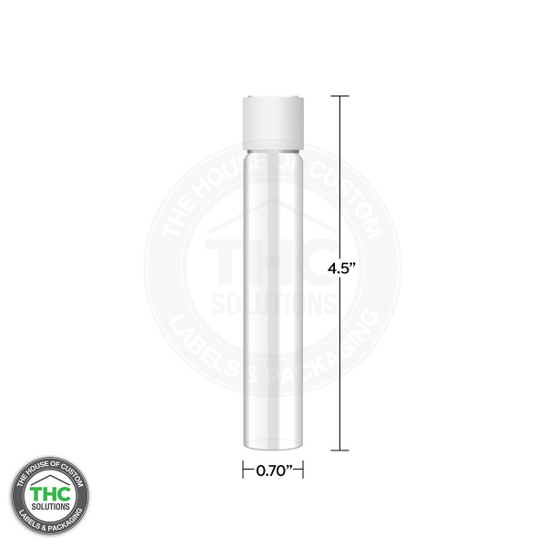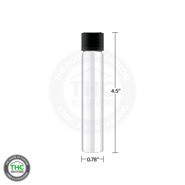 Glass PreRoll Tubes with Symmetric Smooth Sided Cosmetic Child Resistant Closures. These closures do not overhang the vials, eliminating labelling issues.