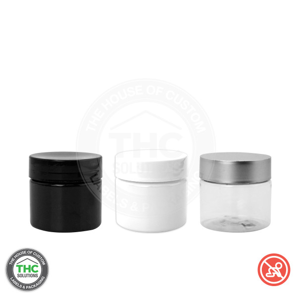 Black PET jars hold 1/8, 1/4, 1/2 oz, 5-10 grams or 1 ounce of product. The size jar you may want depends on the size and density of your buds. Child resistant push down and turn closures meet all CPSC 16.Cfr 1700.20 requirements. Jars are symmetric with the child resistant closure and make a beautiful presentation of your quality bud!