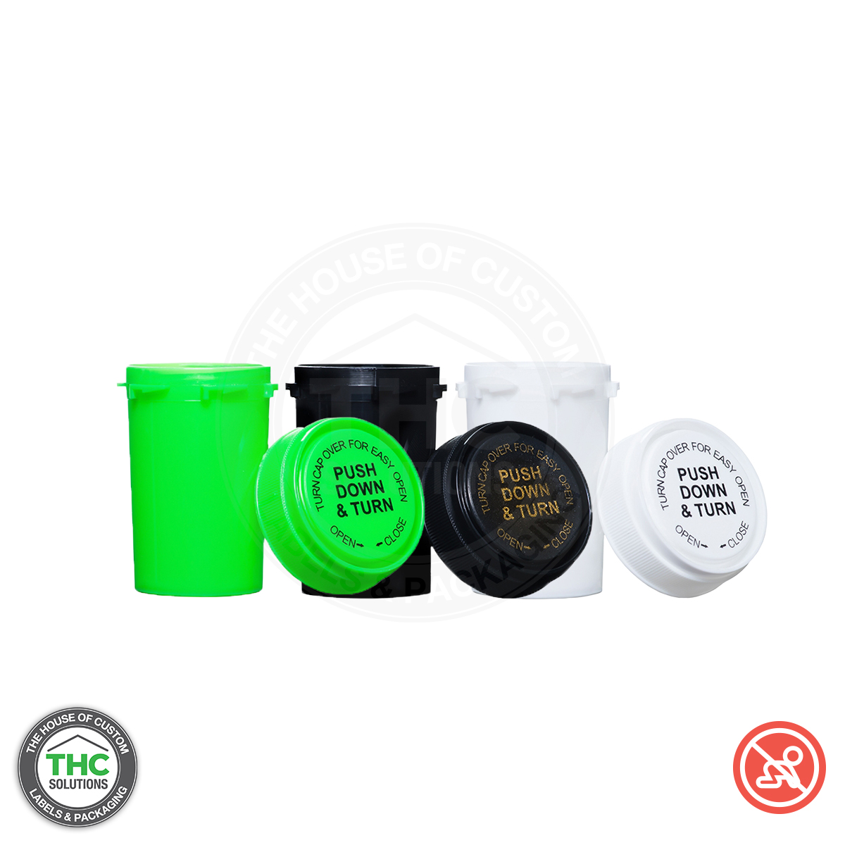 This 20 dram, push and turn, reverse cap bottle is designed to display, store and sell up to 3.5 grams of flower. The cap is a prescription-style push and twist, and is certified as child resistant. The sides leave room for standardized and state mandated labeling. All of our reverse cap bottles are created to seal in freshness, to lengthen potency, and to protect your flowers from rough handling.