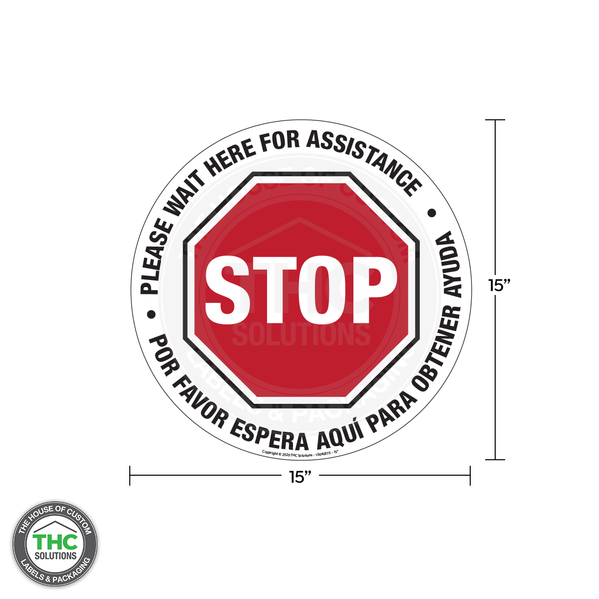 - Please Wait Here for Assistance, Por Favor Espera Aquí Para Obtener Ayuda - STOP - Floor Safety Sign.