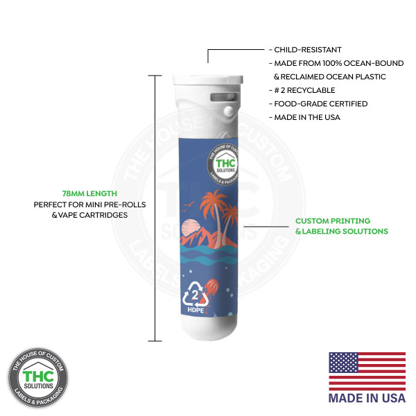 These reclaimed ocean plastic pre-roll tubes are fully customizable. Make your brand stand out with your custom label design or custom tamper evident labels for your pre-roll tubes to help create a clean and sleek look